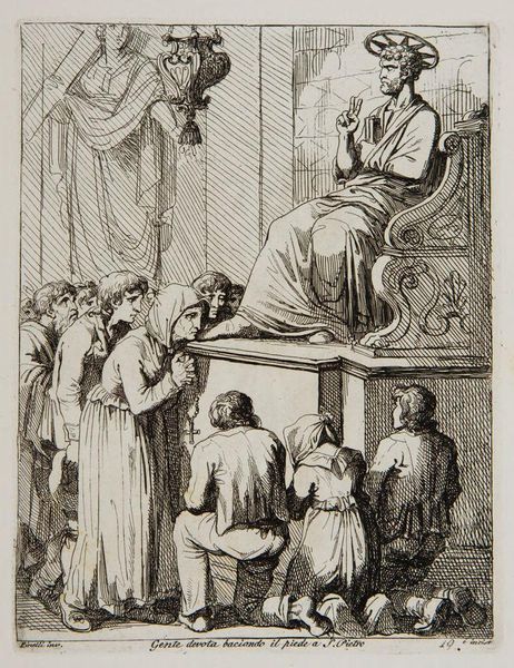 Curator: This is Battista Angolo del Moro's "Christ Taking Leave of His Mother." Editor: The etching technique creates a striking contrast between light and shadow; it feels intimate, almost a private moment. Curator: The cross symbol in the background, together with Christ's halo, speaks to a wider narrative of sacrifice and resurrection. The passing of the cloth, or veil, from the Virgin could signify the passing of power. How do you read it? Editor: I see the shroud itself as a potent image, imbued with both suffering and the promise of redemption. It's a poignant reminder of Christ's journey and his mother's grief. Curator: It's a fascinating dialogue, as the work itself suggests a conversation between the earthly and the divine, filtered through our own understandings of power, faith, and gender. Editor: Absolutely, the symbols connect us to centuries of belief, prompting reflection on mortality and the enduring power of faith.