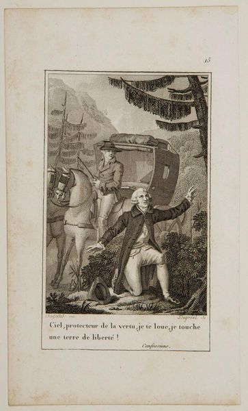 Editor: This is "Vigorous exercise dampens tender feelings," an engraving by Jean-Louis Delignon. The figures seem caught mid-motion, almost frozen. What do you see in the composition that stands out to you? Curator: The converging lines created by the rifles immediately command attention, drawing the eye towards the implied focal point between the figures. Observe how the artist manipulates light and shadow to define form and create depth within the relatively small frame. Editor: That’s fascinating; I hadn't noticed how the lines draw you in like that. Curator: Indeed. The dog also adds a crucial element of dynamism and spontaneity that enhances the artwork's overall effect. Consider its posture—how does it contribute to the piece's meaning? Editor: Now that you mention it, the dog creates a sense of forward motion. I see how each element works together now. Curator: Precisely. This piece is a lesson in the interplay of formal elements to convey a message, don't you think? Editor: Definitely. I'll be sure to look at the underlying structure of artworks from now on.