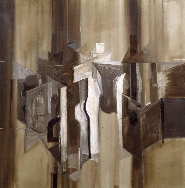 Curator: This unsettling “Untitled” painting is the work of Zdzislaw Beksinski. Though undated, it exemplifies his disturbing, surrealist explorations through oil paint and matter-painting techniques. Editor: My first reaction is profound unease. The monochromatic palette contributes to an atmosphere of decay and abandonment, which speaks to mortality in ways I'm finding hard to grapple with. Curator: Let’s break it down. Notice the stark contrasts Beksinski achieves. The heavy, almost brutal texture of the forms set against the implied vastness of the background pushes the visual plane. The ambiguous shapes evoke, perhaps, architectural remnants or even tormented figures. Editor: I agree; the scale of this is deceiving until you appreciate that these structures – monuments, possibly – are framing what reads like figures, shrouded and collapsing in on themselves. Given that Beksinski experienced deep personal loss in his life, is it possible that these motifs can speak to historical trauma and generational loss as well? Curator: Quite possibly. One must consider the political context, especially from post-war Poland in the Eastern Bloc. Beyond the deeply psychological symbolism, we have a striking command of formal values here: tone, balance and texture creating emotional resonance independent of subject. Look how these geometric forms break in the hazy light in the upper area and dissolve against what seems to be a source of vast empty illumination. Editor: I do notice it. However, Beksinski himself resisted simple interpretations. It's also hard to divorce his artistic intentions from the history and function of his works. Given that many museums declined to exhibit his paintings at the time due to their disturbing nature, they weren’t simply received. Beksinski challenged expectations through a form of emotional radicalism. Curator: And in the way he engaged these techniques he brought to life unique surreal dimensions. We cannot ignore Beksinski's aesthetic mastery which helps translate feelings through careful orchestration of form. Editor: This piece functions as more than just surface interactions: its lasting impact comes from this unsettling view of the human condition within socio-political constructs. It is still generating challenging conversation, it would seem.