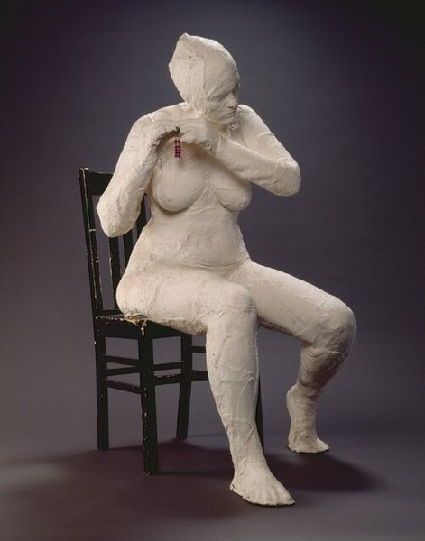 Curator: Louise Bourgeois' sculpture, "St. Sebastien," from 2002, is quite a striking piece. Editor: It’s undeniably unnerving. The vulnerability is almost palpable – that fleshy, pink figure pierced with arrows... It brings to mind a raw exposure. Curator: Bourgeois often engaged with ideas of pain and trauma. Looking at the materials—the soft, yielding form contrasting with the cold, metallic arrows—speaks volumes about the violence inflicted upon bodies and, metaphorically, the psyche. Editor: Absolutely. It is an assemblage—a constructed reality that forces us to think about the labor, not just in representing Saint Sebastian, but also in physically making and putting it together. The base, the figure, the punctures, each is a stage of production we need to acknowledge to have this image in front of us. Curator: Precisely! Saint Sebastian, historically depicted as a beautiful, almost serene, martyr is here abstracted, made disturbingly corporeal. Bourgeois disrupts that passive, victimized narrative. Instead, the sculpture exudes a complicated agency, perhaps a scream against suffering. What is this nude representing about a society that profits and finds pleasure in inflicting harm and precarity on living things? Editor: The rough, stitched texture contributes to that unease, as if we are confronted with something unfinished, still under construction, almost like an incomplete processing of personal history made visible. It denies us the polish of idealized suffering and it invites discussion around where pleasure comes from. It disrupts consumption too because it reveals its method. Curator: Indeed. This speaks to her broader practice where themes of childhood trauma, sexuality, and the female experience are consistently dissected. It almost reframes traditional narratives. This artwork makes no pretense of representing, instead is performing an image as itself—an entity constructed and performed as itself. Editor: I’m left thinking about the social structures and economic conditions that dictate our relationships with labor, consumption, and pain—as if the history of the studio meets the globalized realities that underpin production in the 21st century. Curator: An unforgettable reminder of the material weight and emotional impact woven into our existence. Editor: Absolutely. The sculpture stays with you—the uncomfortable feeling persists, challenging easy interpretations, and forcing reflection about materials in contemporary sculpture and also about the state of things, more broadly.