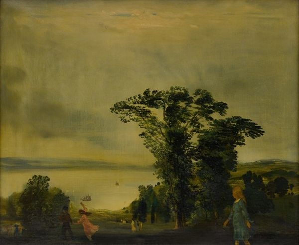 Editor: The air in Richard Oelze’s 1936 oil painting, "The Expectation," feels thick with suspense, doesn't it? What’s your take on it? Curator: Yes, an immediate stillness strikes the eye, despite the impending storm visually coded in the background; it almost paralyzes the viewing experience. Note how Oelze deployed a monochromatic, restricted palette – sickly green, soiled white, ashen gray –to subtly emphasize formal relationships above all else. Editor: Absolutely. These muted tones lend the crowd a haunting, almost spectral presence. Are we seeing, perhaps, a reference to some deeply-rooted anxieties, symbolized through the gathering? Curator: Conceivably, although I prefer to address it from the composition viewpoint. Observe how the mass of figures merges into a horizontal line at the base, contrasting against the towering storm overhead. This contrast in vertical scale adds layers to a basic foreground-background structure, providing symbolic elements based purely on scale. Editor: An interesting point. From an iconographic standpoint, gatherings often represent collective unconsciousness or shared destiny. Could the figures' averted gaze into the landscape signify an unknown future, loaded with psychological expectation or even dread? Curator: That relies too heavily on conjecture for my sensibility, however I must agree on the effect of an ‘unknown future’, and must grant that a dread might be triggered given that color scale is used to make a perfect symbiosis with the topic. My primary concern is with how these ideas come into being through line, light, and texture—the semiotic framework, if you will. For instance, there’s something decidedly *off* about the smooth texture of their cloaks compared to the scumbling effect employed across the stormy sky. It is by this divergence alone that we perceive dread. Editor: That contrast certainly contributes to the unsettling mood, as if reality itself is fraying. A collective gaze awaiting an external event could highlight humanity's susceptibility to manipulation or collective delusion… don’t you think? Curator: You speak as though "humanity" were a cohesive subject. It is this subjectivity to begin with what needs an approach; in any case the answer would remain in the use of textures! Consider this more so when you compare those specific figures to a wider variety and scale such as a mass following political or ideological flags during this historic turn of events, then texture matters far less... Editor: That’s true, but in my interpretation Oelze is reflecting, consciously or otherwise, Europe’s unease on the cusp of World War II, translating the anticipation into something ominous, internalized… Curator: Or consider perhaps just a masterfully executed arrangement of visual forms interacting with the space on the canvas. But alas, your psycho-historical reading of such pictorial content—while perhaps insightful—does rather eclipse the painting’s structural significance for me. Editor: Perhaps it's in the fusion of form and implied narrative where its power lies. Food for thought, indeed.