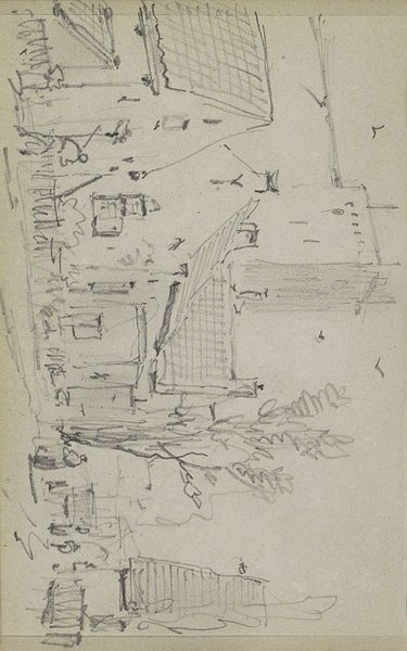 Editor: Here we have Adrianus Eversen's "View of Oudewater with the St. Michael's Church," a pencil drawing from around 1828-1897. The sketch feels very immediate, almost like a fleeting impression of the town. How do you interpret this work? Curator: I see a deliberate act of witnessing. Sketches like this were integral to 19th-century landscape artists, weren’t they? They become documents of a specific moment in time, capturing the spatial relationships between structures and nature. It reminds us of the rapidly changing urban landscapes of that era and begs us to consider what exactly was being "conserved" in such representations? Were these landscapes available to all? Editor: So, it's not just a simple landscape; it reflects societal shifts too? Curator: Absolutely! Eversen’s choice of Oudewater, a town with its own distinct history, signals a consciousness of place. Think about the socio-economic power dynamics at play in how land is represented and who controls its narrative. How does Eversen's focus shape our understanding or perhaps misunderstandings of that space? Does his rendering democratize the experience of the area? Editor: That's a perspective I hadn't considered. I was mostly caught up in the aesthetic simplicity. Curator: And the aesthetic has its role. The sketch-like quality can challenge the grand narratives often associated with landscape painting. It makes us think of the conditions for the common person during that time. Who inhabits these sketched streets and buildings in your imagination? Editor: I guess I assumed a quaint, picturesque view. But framing it through the lens of social dynamics changes everything. Curator: Precisely! Art doesn't exist in a vacuum; it mirrors and refracts the complexities of the world around it. We must acknowledge those reflections. Editor: I'll definitely approach landscape art differently from now on. Thanks for making me see it more politically. Curator: And thank you for staying curious and questioning dominant readings. That's the key to unlocking richer understandings of art's place in our world.