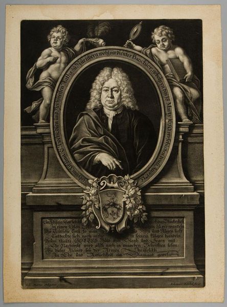 Editor: This is Antoine de Marcenay de Ghuy’s portrait of Victor de Riquety, Marquis de Mirabeau. It's a print, and it feels very formal and staged. What social dynamics do you think are at play here? Curator: This portrait embodies the rigid social hierarchy of pre-revolutionary France. Note how Mirabeau is presented almost like a sculpted bust, encased in stone. The armor suggests power and authority, but also perhaps a defensiveness against the changing tides. Do you notice how the inscription elevates his lineage? Editor: Yes, it's very prominent! It seems like they're really emphasizing his noble status. Curator: Exactly. It’s a deliberate act of self-presentation, reinforcing his place in a world on the brink of radical change. The artist is making a statement about power. Editor: I hadn't considered that level of social commentary. It gives me a totally different perspective!