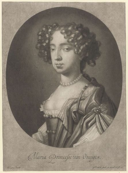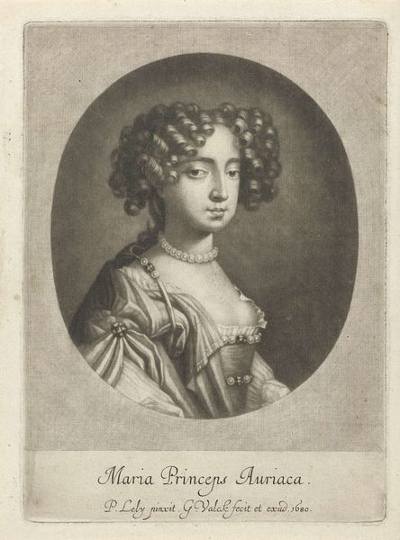 Editor: Here we have a drawing, ink on paper, portraying Maria II Stuart. It's dated 1679 and currently resides in the Rijksmuseum. What strikes me most is the formality, almost severity, in her gaze despite the ornate curls. What do you see in this portrait? Curator: Well, it's crucial to consider the context. This image, likely intended for reproduction and dissemination, presents Maria not just as an individual, but as a symbol of the Stuart dynasty. It's an example of royal image-making. Who do you think would have consumed or engaged with the image? Editor: Possibly other members of the aristocracy? People aligned with the Stuarts, definitely. Curator: Exactly. Think about the politics of the period, the anxieties surrounding succession, religious conflicts, and shifting alliances. Royal portraits like this served to project power and legitimacy, particularly important for female rulers who were often subjected to intense scrutiny and expected to embody particular virtues and roles. Do you see the text written around her portrait and how that might reflect on the importance of this image for the people back then? Editor: I see “Maria Princeps Auriaca” on the edges, a pretty blatant reminder of her title and connection to nobility. I guess this piece does more than meets the eye. Curator: Precisely! And remember, even something that seems simply decorative like her hairstyle, sends very specific cultural signals about status and allegiance in the late 17th century. So the question becomes, not just what does it depict, but what work does it do? Editor: It makes you realize portraits like this weren't just about likeness; they were powerful propaganda tools. I'll never look at a royal portrait the same way again. Curator: And that’s the fun of looking at art from a historical lens. It opens up a whole new understanding!