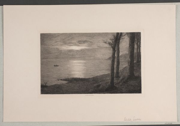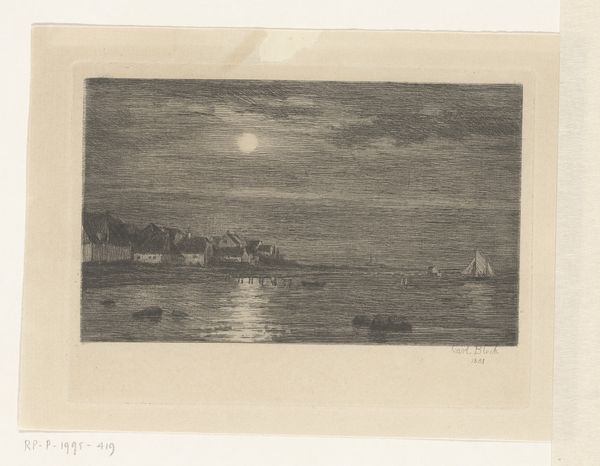 Editor: Here we have Carl Bloch’s 1881 etching, "Strandparti ved Hellebæk. Måneskin," which translates to "Beach Scene by Hellebæk. Moonlight." The scene is immediately striking, a kind of somber yet peaceful landscape bathed in what appears to be moonlight. How would you interpret this piece? Curator: The beauty lies, wouldn't you agree, in its capacity to evoke atmosphere, and stillness. It feels like a captured memory. For me, the etching embodies the Romantic era's fascination with the sublime, with a focus not just on beauty but on that profound and slightly melancholic awe we feel in the presence of nature. How does the muted palette speak to you, almost whispering stories of a time gone by? It’s both romantic, and also so, so real. Editor: The detail achieved with just etching is remarkable. The moon reflecting on the water adds a dreamlike quality that contrasts the sharp, detailed edges of the houses, a scene you could almost step into. Curator: Exactly! See how he juxtaposes the calmness of the water and the activity in the little Hamlet of Hellebæk? One can imagine a family returning from the docks and sitting down to a late dinner after a long day's journey at sea. It could also point to the transition from the busy daytime into a restful night, perhaps suggesting a human yearning for serenity. Does the stillness almost suggest something ominous to you, something not seen or only remembered? Editor: That’s a beautiful point. It never occurred to me it was an ending but now I’m seeing it more. The quiet houses reflecting that lunar path, really something! Curator: These etchings become windows. Next time you’re by the sea in moonlight, let your mind go, remembering that what’s visible isn't the whole story.