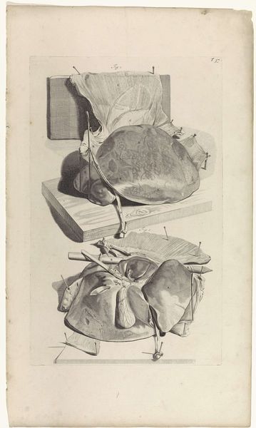 Editor: This is "Anatomische studie van het hart," or Anatomical Study of the Heart, from 1685 by Pieter van Gunst. It’s an engraving with graphite. The image is very detailed, and somewhat unsettling! What's striking is how objectively the heart is depicted. What do you see in this piece beyond the literal depiction of a heart? Curator: It's unsettling precisely because it’s an objectification. Think about the Enlightenment context; science sought to dissect, literally and figuratively, the natural world to understand and control it. This image isn't just about anatomical accuracy; it speaks to a shift in how humans perceived themselves and their bodies – a move away from the heart as a symbol of emotion and spirituality, towards seeing it as a mechanical object, part of a larger system. How might this relate to social power structures? Editor: Well, if we understand the body as a machine, doesn’t that create space for people in power, typically white men during the Enlightenment, to exert control over other people’s bodies, particularly those of women, enslaved people, and the poor? It dehumanizes those who are already marginalized. Curator: Precisely! And consider how this pursuit of "objective" knowledge was often funded by, and served the interests of, colonialism and the exploitation of resources and people. The detachment seen in this engraving, this clinical view, isn’t neutral. It has real-world consequences when applied to social relations and the treatment of different groups. It is a tool used for marginalization. Editor: So, seeing this image now invites us to question what “objectivity” really means and whose interests it serves? It’s not just a historical artifact, but a mirror reflecting the complex relationship between power, knowledge, and representation. Curator: Exactly. We can ask how the lingering effects of these historical perspectives continue to impact how we understand identity, medicine, and even social justice today. Editor: That gives me a lot to consider about the supposed neutrality of science and its entanglement with power structures. Thank you.