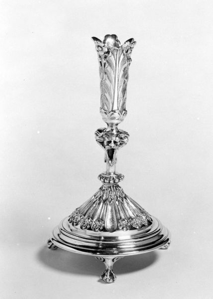 This candlestick was crafted by Diego Gonzales de la Cueva, in the 18th century. Immediately striking is the intricate play of geometry and light across its silver form. Observe how the octagonal base transitions into a complex series of curves and rectilinear elements that ascend towards the candle holder. This shape creates a rhythmic visual experience, almost musical in its composition. The candlestick is more than a functional object. It embodies a semiotic system where each curve, line, and angle serves as a signifier. The reflective surface captures and distorts light, constantly altering the viewer's perception and challenging the stability of the object's form. We see how De la Cueva uses the medium to engage with contemporary philosophical ideas about perception and representation. Notice how the verticality of the design is grounded by the firm base, creating a sense of balance and stability. This interplay between stability and the dynamic movement of light functions aesthetically and anchors the candlestick in broader cultural discourses about order, beauty and the human relationship with the divine.