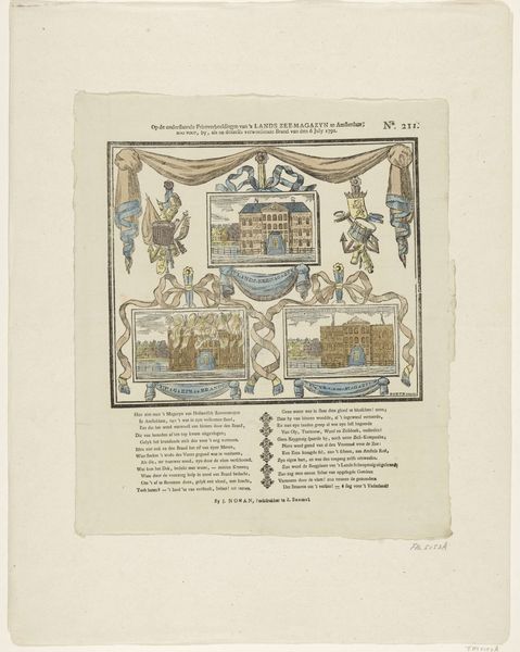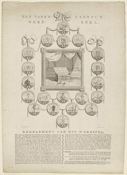 Curator: Let’s discuss "Het vaderlandsche werpspel," created in 1786. The work, whose title translates to "The National Throwing Game," resides here at the Rijksmuseum. Jan Oortman Sr. created it, using a mix of etching, engraving, and watercolor on paper. Editor: It looks like an ornate game board! All these charmingly awkward figures, connected by what looks like little ribbons, give me a sense of quirky, slightly chaotic, energy. I want to know how it works! Curator: The work employs an allegorical framework representative of the Neoclassical period. Each of these little scenes, presented within circular medallions, comments on Dutch society, law, and even morality at the time. Editor: So it's a political commentary disguised as a game? The figures, for instance—what do they represent? Some of them seem to be up to no good! Curator: Precisely. Some figures represent professions or social classes. Others represent various vices or virtues. The "throwing game" aspect lies in deciphering these symbols and their interconnectedness within the societal structure. This work critiques the flaws that can undermine civic virtue and national unity. Editor: And that little structure at the center, draped with blue curtains... It feels almost theatrical, or maybe legal? Curator: The centerpiece depicts a lottery box, signifying the element of chance and perhaps the unpredictable nature of political and social fortunes. The overall design emphasizes order, but with each individual vignette offering insight into the realities and the societal dynamics that existed during this pivotal time. Editor: Knowing that elevates the work beyond a mere visual curiosity. Suddenly, it’s speaking to power, corruption, even societal anxieties that resonate today. Curator: Absolutely. When we view such artwork, we begin to analyze historical contexts through a wider lens, one that encourages dialogue around the politics of representation and historical interpretation. Editor: I see something new every time I look! This print is really just a snapshot of a society playing out its roles. Curator: Indeed. It reveals as much about the anxieties and aspirations of 18th-century Dutch society as it does about art's power as social commentary. Editor: And reminds us that sometimes the most profound observations are packaged in the most playful forms.