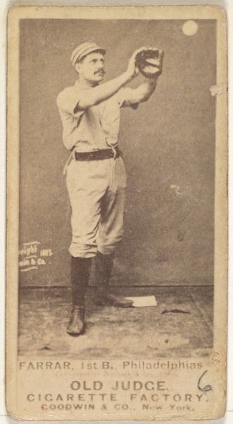 This is a photograph of Charles Buffington, a baseball player for Philadelphia, made in 1887 by Goodwin & Company. It’s a simple albumen print, a thin paper coated with egg white to give it a glossy surface. What’s interesting is the way this image was produced and disseminated, not as art, but as part of the "Old Judge" cigarette brand. Goodwin & Company mass-produced these cards, inserting one into each pack of cigarettes as a promotional item. This was a strategy to hook customers on their particular brand. In its time, the card was disposable, intended to be collected or traded by fans, or simply thrown away with the empty cigarette pack. Now, we view it as a valuable historical artifact. This reminds us that the value of images, like all materials, can change over time, and that even something as ephemeral as a baseball card can be seen as a form of cultural production. The photo gives us insight into labor, and a specific moment in the history of capitalism, and its influence on popular culture.