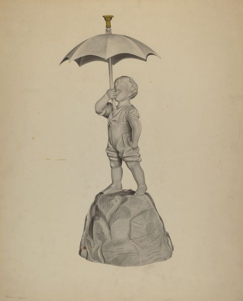 Editor: This is Lee Hager’s drawing, "Sunshade," made with pencil and charcoal sometime between 1935 and 1942. It feels very formal, even severe. What symbols do you recognize in this artwork? Curator: The sunshade itself is deeply symbolic. It represents not just protection from the sun, but also status and notions of feminine virtue. Think about who typically carried a sunshade during this period and what it conveyed about their position in society. Editor: So, it's less about the object itself and more about the person holding it? Curator: Precisely! The sunshade acted as a barrier, suggesting a delicate, protected existence, setting them apart from those who toiled outdoors. And Hager’s choice of stark charcoal enhances this sense of formality, almost like a memento mori. What feelings does that evoke for you? Editor: That's an interesting perspective; the darkness made me think of shadows, perhaps a hidden, less-pleasant side of that protected life. It feels… weighty. Curator: Yes! The shadow side, perhaps even a commentary on the constraints imposed by such a carefully constructed social role. Notice how the handle, almost like a walking stick, hints at a journey, but one carefully controlled and directed. Does that influence your impression at all? Editor: Definitely. It makes me consider how even seemingly simple objects can carry complex stories. It also makes me consider how interpretations might change, even for people viewing art from the same era as its creation. Curator: Exactly. Examining these visual artifacts offers us glimpses into past cultural values and unspoken societal rules that can endure in symbolic language.