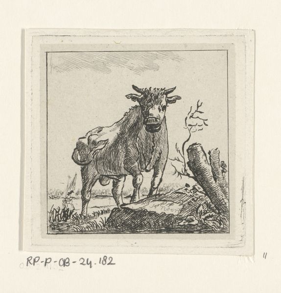 Curator: What strikes me first about this piece is the stark contrast between the delicate linework and the subject itself. Editor: Indeed. The image before us is an etching by Ernst Willem Jan Bagelaar, created sometime between 1798 and 1837, entitled “Koeienkop naar rechts”, or "Cow's Head Facing Right". Curator: Bagelaar seems to have captured something very essential in the animal's form through these minimal, but confident strokes. There's a definite emphasis on contour, creating a strong sense of volume despite the relative lack of shading. I wonder, how did images like this circulate during its time? Editor: Prints like these served varied social roles: circulating agricultural knowledge, certainly, as well as being collected in albums for personal viewing or used as models by students of art and animal husbandry. Curator: That makes a lot of sense. Looking at it purely aesthetically, the restrained color palette really focuses attention on the lines. The diagonal hatching on the right almost implies the motion of the head, turning away. The direction and weight distribution of the strokes evoke realism by creating depth with very few graphic tools. Editor: And even as the technique demonstrates this turn to "realism," you cannot help but consider the significance of these rural, agricultural images to urban viewers, the way such depictions of rural life often evoke a longing for simpler times, even when grounded in empirical observation of animal anatomy. Curator: Absolutely. And perhaps this image served both functions simultaneously. A work of art offering insight and possibly a sense of pastoral retreat into the Dutch countryside. Editor: A quiet, but nonetheless potent, demonstration of art meeting science within socio-political forces of its time, right there. Curator: A potent demonstration indeed. I have new admiration for the level of observation embedded into what initially seemed a straightforward portrayal.