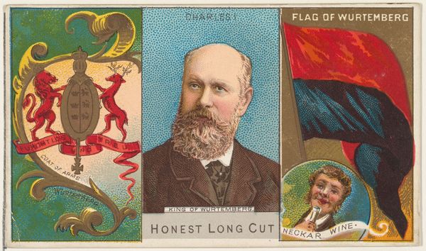 This is "Charles Parnell, Member of Parliament, Ireland," a chromolithograph from around 1887, by W. Duke, Sons & Co. The composition divides the image into three distinct vertical panels, each a semiotic field layered with meaning. On the left, the "Coat of Arms of Ireland" presents a heraldic emblem against a brown backdrop, its elaborate details suggesting historical depth and legitimacy. The central panel offers a portrait of Charles Parnell himself, framed against a muted blue, lending a sense of individual identity and political presence. To the right, we see the "Flag of Ireland," accompanied by a shamrock. The formal arrangement of the artwork is thus not merely decorative; it's a strategic deployment of visual codes, inviting us to consider how identity is constructed and communicated through symbolic forms. The calculated arrangement suggests a landscape where each element—the heraldic symbol, the individual portrait, and the national emblem—functions as a signifier in a broader discourse of nationhood.