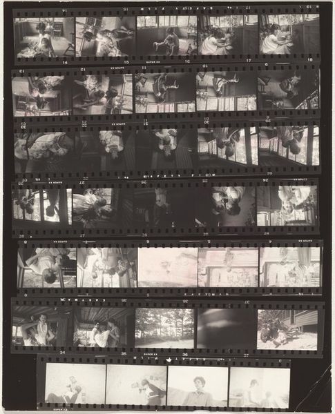 Curator: Looking at "Paris 8" by Robert Frank from 1959, a gelatin silver print, what strikes you? Editor: The gritty, almost raw quality of the print. The contrast is stark, the texture grainy. It feels…immediate. I imagine it mirrors something of the experience on those streets. Curator: It does offer a unique glimpse into Frank's experience. This is actually a contact sheet, and the different snippets provide us with insights not only into Paris itself but also into the material constraints and circumstances surrounding its production. Consider the arrangement: the rows of images—a sequence focused largely on the Eiffel Tower, interspersed with some interiors, and the street, really lays bare his thought process. How do we interpret it? Editor: I immediately look at the Dupont Safety film strip label on the side, it grounds it in a reality of mass-produced materials. This is street photography in its purest form: recording and displaying the actual artifacts generated by the streets, complete with visible sprocket holes, fingerprints, and notes. How much labor and the conditions of photography does one perceive within the work? Curator: Precisely. And who inhabits the streets—in this moment, post-war Paris? The figure of the Eiffel Tower, appearing fragmented and reproduced along the sheet, looms above everything else, dominating like a ghostly colossus, especially alongside the scenes of more anonymous figures on public transport, in the streets. Editor: Almost as though Frank's material practice has revealed something about the social fabric. Curator: He held up a mirror to postwar American culture, which can also apply here in Paris; there is disillusionment and inequality simmering just beneath the surface, rendered visible via high-contrast black and white printing and sequencing that, quite literally, reveals something dark about the social surface itself. Editor: This raw aesthetic really underscores how Frank democratized image-making and photographic display, making it not a singular perfected representation but something more tactile and more indexical. Curator: Indeed. It forces us to ask who has the authority to represent Paris, and through what means? His work challenges us to confront these questions by using those very means. Editor: Seeing it this way has really brought into focus how photography, labor, and class are really working together here. Curator: For me, understanding the historical and social contexts of "Paris 8," brings new dimensions to the work of Robert Frank and photographic practice, too.