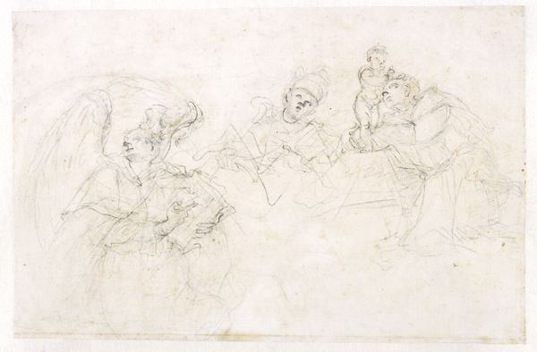 Editor: This is Andrea Celesti's drawing, "The Miraculous Pool at Bethesda." It's undated, rendered in chalk and graphite on paper, and it reminds me a bit of old master sketches, the way the figures emerge from the ground. What catches your eye in this piece? Curator: The compositional strategy is paramount. Observe how Celesti distributes figures across the horizontal plane, creating a sense of depth primarily through variation in scale and line weight, rather than linear perspective. The lines themselves, note their nervous energy, they never fully enclose a form. Instead, they suggest a potentiality, a becoming. Editor: I see what you mean, like the forms are emerging rather than fixed. How does that relate to the subject? Curator: The subject, a scene of healing, lends itself to this aesthetic. Are these bodies being reborn? Is Celesti implying divine intervention through the very act of drawing, never fully resolving the human form? Consider the classical influences: idealized physiques rendered with an almost baroque dynamism, particularly in the musculature and dramatic poses. Does this combination create tension? Editor: Yes, I think so. There's something unfinished, raw about it. You mentioned scale. It's interesting how some of the background figures are nearly the same size as the ones in front. It flattens the space, which I guess pushes the focus onto the relationships between the figures themselves and the act of becoming healed rather than some perspectival trick of space? Curator: Precisely. This flattening emphasizes the composition as an independent entity, directing our attention to the formal relationships: line, form, and their arrangement, and inviting questions of intended, or even perceived, formal harmony versus any underlying themes. Editor: It's amazing how much the technique affects my reading of the subject matter. I never thought about a drawing as a becoming, but that really opens it up. Curator: Indeed. By analyzing the formal elements, we gain insight into the artist's choices and can better appreciate the multilayered dimensions of this dynamic sketch.