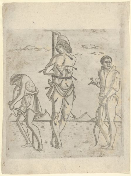 Editor: We’re looking at Giovanni Battista Bracelli's etching "From 'Bizzarie di varie Figure'," created in 1624. What strikes me first is the linear quality, and how the figures are constructed, almost like architectural diagrams. What do you make of it? Curator: The immediate allure is the geometrical construction of the figures. Note how line is not merely descriptive here; it is constitutive. Bracelli seems less interested in mimetic representation and more in exploring the very building blocks of form. The hatching adds texture, but maintains that the piece adheres to its intrinsic structural logic. Editor: I see what you mean! So, is it less about what they are doing, and more about how they're formed? It’s almost like deconstructing the human figure into basic shapes. Curator: Precisely. Observe the ways in which Bracelli disrupts the conventional figure through strategic angularity. Look, too, at the contrast between organic elements—the hair, the musculature—and those sharp geometric volumes of the body. Notice, finally, that what one figure appears to lack, the other complements. Is there a system? A unity here? Or are we meant to infer a degree of irreconcilability? Editor: That's a compelling way to see it. I initially missed the counterpoint in the rendering of these figures; their individual presentation now feels balanced, or like there's an unspoken symmetry. I appreciate how analyzing these formal elements opens a door to broader questions about representation and artistic intention. Curator: Agreed. Focusing on these components allows a far deeper appreciation, beyond the superficial depiction of subject matter. These structural devices unlock profound readings about perception and materiality, wouldn't you say?