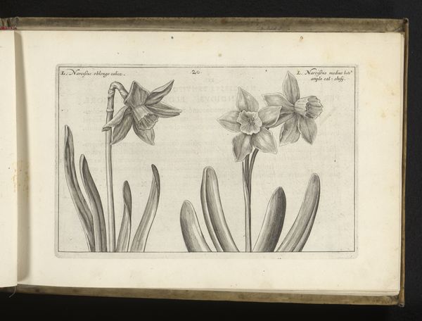 This engraving, "Herfsttijloos en een variant" by Crispijn van de Passe II, made sometime between 1597 and 1670, presents a meticulously rendered botanical study using the stark contrast of line etching. The composition arranges various forms of the autumn crocus in a regimented yet organic manner. The lines, precise and deliberate, delineate the texture of petals and leaves, creating a delicate interplay between light and shadow. Notice how the artist employs a semiotic system of naturalism and nascent scientific inquiry, presenting the flowers not merely as aesthetic objects, but as specimens of natural philosophy. The varying perspectives and orientations of the flowers introduce a structural instability, inviting viewers to consider the complexities of representation. The artwork encourages ongoing interpretation of the natural world through the structured lens of artistic expression.