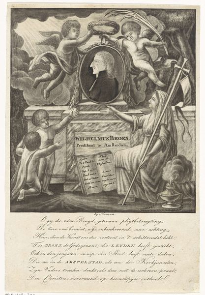 Robbert Muys created this print, Drie putti, using etching around 1749. Observe the putti, these cherubic figures, symbols of innocence and divine love, hark back to classical antiquity, where Eros and Cupid reigned. Here, they are not merely decorative; they embody powerful ideas. The putto with Mercury's winged cap holds a book, while another presents a flag. Notice how the image resonates with similar depictions across centuries – from Renaissance paintings to Baroque sculptures – each reiteration subtly shifting in meaning yet retaining a core essence of youthful vitality. This visual language taps into our collective memory, stirring emotions and subconscious associations tied to innocence and purity. The gesture of the putto pointing, for instance, is a recurring motif, linking this piece to broader traditions of visual storytelling and symbolic communication. These symbols are not static but evolve, resurfacing in new guises, shaped by the currents of history and human experience.