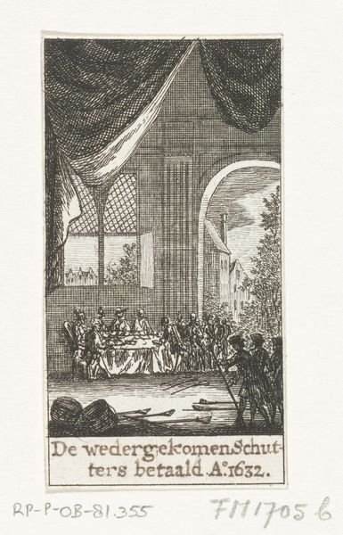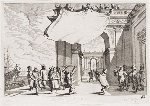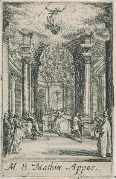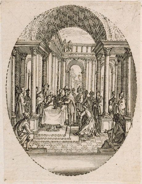 Curator: Here we have Jacques Callot's "Last Supper," a striking etching currently residing at the Harvard Art Museums. Editor: The first thing that jumps out is the intricacy, given its small scale. It feels almost gothic, with that heavy architectural frame looming over the scene. Curator: Absolutely, the context is crucial. Callot created these prints amidst religious and political upheavals in 17th-century Europe; prints like these were readily available to the public and shaped views on faith. Editor: And look at the way the light emanates from Christ; it draws the eye but also emphasizes the material: the ink, the paper, the very process of etching used to convey that divine moment. Curator: Precisely, he uses the readily available medium to convey sacred events, and that has a social impact. Editor: It's a powerful reminder of how art can democratize access to powerful narratives through accessible production. Curator: Indeed, it offers a lens into understanding the power of imagery in the 17th century. Editor: This little etching really makes you think about the big picture.