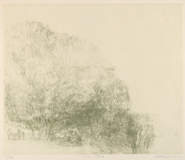 Curator: This is Colin Self’s "Out of Focus Objects and Flowers," an ethereal print now held in the Tate Collections. Editor: My first thought is that it feels haunted, like a fading memory or a fragile ecosystem on the brink. Curator: Self was deeply concerned with environmental anxieties and socio-political issues. The "out of focus" aspect could be interpreted as a critique of our blurred vision regarding ecological crises. Editor: The very act of rendering such delicate subjects in such an almost ghostly way feels potent. It certainly reflects how political forces often obscure or distort ecological realities. Curator: True, and as a trial proof, it also offers a glimpse into the artist's process, making the work more accessible and democratic, engaging the public in the development of art. Editor: It’s a beautiful interplay between art and activism. The quietness of the piece speaks volumes, don’t you think? Curator: Absolutely, a powerful commentary embedded within its delicate form.