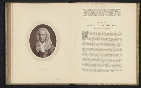Editor: We’re looking at a portrait of Cardinal Manning, created before 1876 by Lock & Whitfield. It's an albumen print, beautifully preserved in an album. I'm struck by how the oval framing accentuates the sharp angles of his face. What compositional elements stand out to you in this photograph? Curator: The tonal range of the albumen print is remarkable. Notice the subtle gradations from light to shadow, how the photographers use this to model Manning’s features and evoke a sense of depth despite the two-dimensionality of the photograph. Consider how the tight cropping of the oval emphasizes the sitter's profile and redirects attention to his austere expression, a formal choice shaping our reading of the prelate's character. Editor: That makes me think about the effect of repetition - how the oval of his face is repeated by the outer frame. The stark contrast, combined with its tight framing, really amplifies the seriousness. Do you think the choice of albumen print impacts our interpretation? Curator: Undeniably. The albumen print process yields an image with exceptional clarity and detail compared to other photographic methods of the time. This high level of detail allows the photographers to meticulously record Manning’s likeness and the texture of his vestments, lending the image an air of authority and permanence, reflecting the sitter's status within the church. Are the geometric aspects creating more meaning than the symbolism, in your view? Editor: That's a fascinating perspective. Focusing on the image itself, I see the interplay between the light and shadow, geometry and stark detail, to show how a formal portrait becomes almost austere. Thanks! Curator: Indeed. It is through considering the visual elements that the photograph finds itself in its purest representational form.