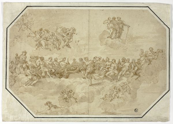 Giovanni Battista Gaulli created this drawing, Prophets, Patriarchs, Saints, and Music-Making Angels in Glory with pen and brown ink, with brown and gray wash, over black chalk underdrawing. The composition is strikingly divided into three horizontal registers, each filled with swirling figures atop voluminous clouds. This arrangement doesn't create a sense of harmonious integration but rather emphasizes a tiered hierarchy of divine presence. Gaulli employs a limited palette, focusing on tonal variations of brown and gray, which serves to unify the disparate groups of figures. The dynamism of the scene is palpable through the swirling lines and dramatic lighting, evoking a sense of Baroque theatricality. There are no clear vanishing points, and this flattening disrupts any conventional understanding of spatial depth. This effect underscores the symbolic nature of the scene, where theological concepts take precedence over representational accuracy. The loose, gestural quality of the drawing lends it an ethereal quality, fitting for its celestial subject matter. Consider how Gaulli uses line and wash not just to depict forms but to construct a visual theology. The drawing challenges viewers to contemplate the nature of divine order, not through linear perspective, but through the dynamic arrangement of form.