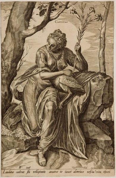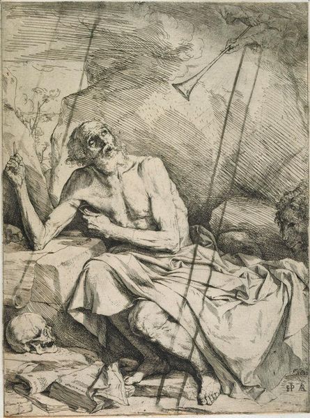Curator: Ribera's "Saint Jerome and an Angel," now at the Harvard Art Museums, presents us with a fascinating interplay of mortality and the divine. The etching captures Jerome in a moment of inspired contemplation. Editor: It strikes me as remarkably intimate. The angel hovering above, its trumpet a symbol of divine communication, feels less like a celestial announcement and more like a shared secret. Curator: Ribera masterfully uses the symbols here: the skull representing mortality, the lion signifying Jerome's taming of the beast, all within this small, personal scale. This work circulates hagiographic narratives but it also shapes the perception of holiness itself. Editor: And the textures! Look at the contrast between Jerome’s wrinkled skin and the angel’s smooth form, or the rough rocks versus the soft clouds. It’s a visual feast of symbolic layers. Curator: Absolutely. The image taps into the tradition of showing spiritual authority, but offers a surprisingly human moment. Editor: It’s a reminder that even within religious iconography, we find echoes of humanity.