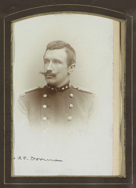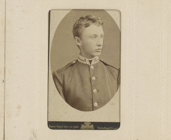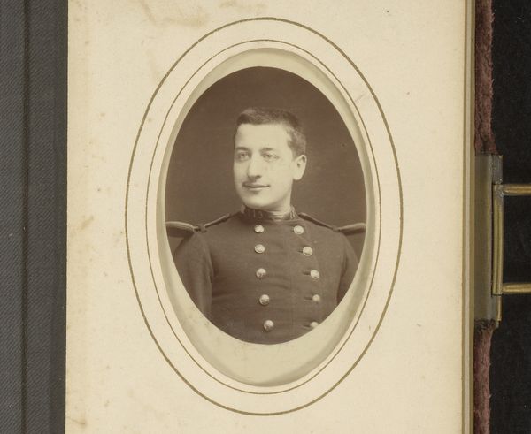 This is a carte-de-visite portrait of an unknown man in uniform, created by Albert Greiner, likely in the mid-19th century. The sepia tones and small scale invite a close, intimate viewing. The composition is structured by the oval frame that neatly contains the man’s figure, creating a sense of order. The subject is centered, his gaze direct, which conveys a feeling of self-assuredness. The buttons on his uniform create vertical lines, contrasting with the soft curve of the frame. This juxtaposition is a visual play between structure and fluidity. The photograph speaks to the emerging cultural codes around portraiture and identity in the 19th century. Here, the uniform functions as a signifier of social role and status. Consider how the formal elements like the subject's pose and the photographic medium itself contribute to constructing an image of authority and respectability. This image prompts us to reflect on how such visual codes shape our understanding of identity.