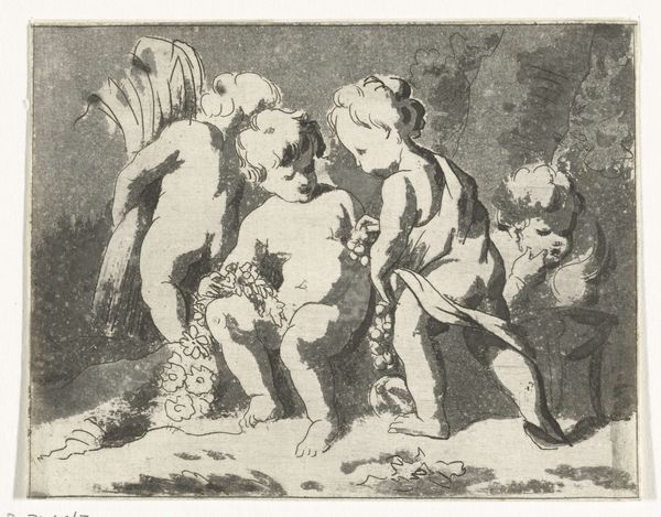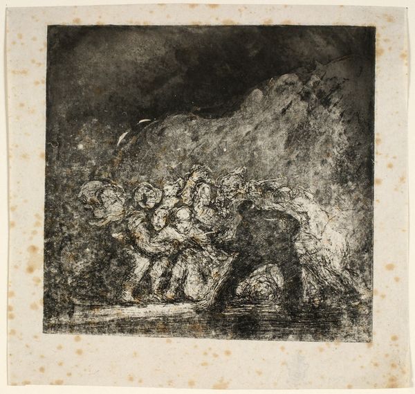 Curator: Here we have "To kvinder slås om en mand", or "Two Women Fighting over a Man" by Oluf Hartmann, created around 1906. It's a striking print, combining aquatint and etching techniques. Editor: It’s raw. There’s a frenzied energy in the scratches, almost like visual shouting. I can practically hear the cries emanating from this small piece. Curator: Absolutely, and in viewing this artwork through a contemporary lens, we might question the representation of conflict and gender dynamics it presents. How does it reinforce or challenge societal norms concerning female relationships and male objectification, specifically in the art world, during the early 20th century? Editor: Visually, my eye keeps going to the man at the center, doesn’t it? But he is rendered almost as a blank space, which ironically puts the two women into stark contrast. It feels very performative, wouldn’t you agree? His raised arm and open stance suggest conflict or drama. One can look into symbols to further contextualize the relationship dynamics, perhaps a battle of equals, but about what? Curator: The historical context is essential; consider the rise of feminist movements coinciding with this era. Did Hartmann consciously engage with or subvert these developing ideologies in the graphic arts? Are we merely reinforcing established power structures simply by observing and analyzing this struggle, or can such observations incite change? Editor: Hartmann is exploring deep-seated human emotions: jealousy, desire, and the primal urge to compete for attention or resources, all universal, almost archetypal representations here. His symbolic gestures hint to both classic struggles, yet feels incredibly contemporary. Curator: Right, considering these prints are often more accessible than painting to a wide array of the population and their use as political tools; it allows the imagery and their implicit values to penetrate deeper into the population and popularize particular narratives. Editor: Seeing Hartmann's print helps clarify how those emotions—and power struggles—become visually encoded. It gives historical roots and weight to our modern iconography of relational competition. It shows this drama is anything but modern. Curator: Precisely, art helps us examine historical antecedents to contemporary culture, inviting us to interrogate assumptions around conflict and competition. Editor: It certainly leaves a lot to consider on how representation shapes us as a society through visual cues and repetition, from his etching to now.