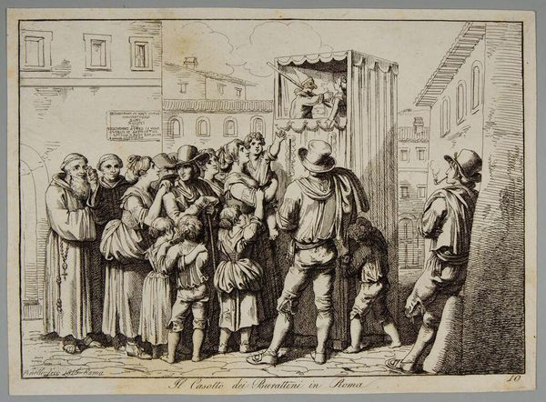 Curator: Bartolomeo Pinelli, born in Rome, gives us "The Charlatan in the Piazza." It depicts a lively street scene, all in etching. What leaps out at you? Editor: It feels like a performance of societal anxieties—a visual commentary on trust and manipulation within public spaces. Curator: Precisely! The charlatan, elevated on his makeshift stage, becomes a figure of authority, exploiting the vulnerabilities of his audience. Editor: He's preying on the marginalized—a common tactic, then and now, using spectacle to distract from genuine need and systemic issues. It’s timeless! Curator: Agreed. The power dynamics here are just so naked, laid bare. Editor: Leaving us to reflect on who holds the stage and who's left watching.