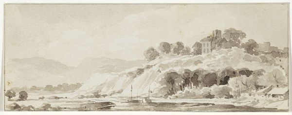 Curator: Welcome. Before us we have a drawing titled "View of an Ocean Bay" by Friedrich Wilhelm Hirt, housed here at the Städel Museum. It’s rendered in ink, presenting an expansive landscape scene. Editor: It feels quite dramatic, actually. There's something about the monochrome wash and the precarious bridge that suggests a journey or a crossing, almost biblical in scale but rendered quite delicately. Curator: Precisely. Hirt's landscapes were heavily influenced by the Baroque style, though it seems hard to date this piece definitively. What we're seeing is a blend of landscape and what could almost be history painting – suggesting a narrative embedded within the vista. Editor: You know, looking closer, it's fascinating to consider the ink itself – where it came from, how it was mixed. There is clear intentionality behind the varying saturations used to achieve atmospheric depth. How the means of distributing pigments creates narrative as much as the scenes depicted. Curator: A sharp observation. Ink, during this period, wasn't just a commodity; it was connected to networks of trade and knowledge. The artist is working within a specific economic and social context. This affects how the image would be viewed. Consider its distribution; intended for private collection, academic study, or perhaps even preliminary studies for larger works. Editor: Right. How labor informed it is interesting too. Notice the varying linework suggesting stages in production of this singular piece, from quickly mapped structural guidelines in pale dilute hues to deeper shadows carefully built up using repeated washes of a purplish grey tone. All the labour embedded. Curator: Definitely a compelling intersection of material and concept. The scene itself presents nature as something to be traversed, even dominated. A reminder of the social hierarchies being visually affirmed through art. The choice of rendering technique, readily available at this time, allows a controlled reproduction for a discerning viewership with sophisticated tastes. Editor: So true. Looking at it through a Materialist lens also brings forward something profound – how simple raw materials, a humble pigment and surface combined with physical movement result in this impactful image now presented at an institutional setting for the public to reflect on its power and complex roots in labor, extraction, or economy. Curator: Indeed. A landscape drawing, yes, but also a snapshot of social, political, and material histories intertwined. Editor: Food for thought! Thanks.