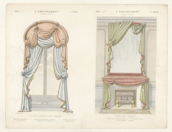 This print by Léon Laroche features two window designs, likely produced as inspiration for interior decorators. Though seemingly ephemeral, curtain design was a serious matter, requiring collaboration between designers, upholsterers, and seamstresses, all highly skilled in their trades. Consider the amount of labor embedded in these elaborate draperies: the weaving of the fabric, the cutting and sewing of the components, the pleating, the swags, the tassels. Each element involves a careful hand and an understanding of material behavior. Note the contrast between the heavy, light-blocking fabrics and the sheer lace, each with its own set of textural and visual properties. Such materials would have been costly, available only to the upper classes, and they would have served a practical purpose while signaling elite status. While we often think of art as being distinct from the world of labor and commerce, this print reminds us that even the most functional designs carry cultural and social meaning.