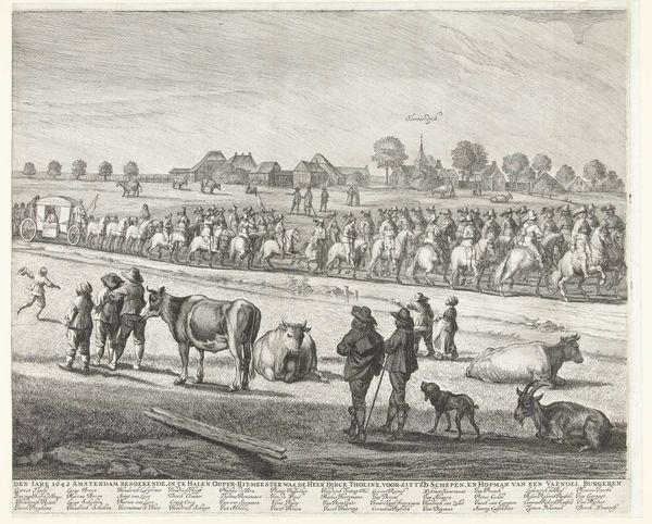 Pieter Nolpe created this print in the Netherlands, depicting the procession of Queen Henrietta Maria in Amsterdam. It's made using the intaglio process of etching, where lines are incised into a metal plate, inked, and then transferred to paper under high pressure. The etched lines lend a graphic quality to the scene, describing the figures and landscape with precision. Look closely and you can see how the material properties of metal and paper define the image. The sharp lines create a sense of depth and movement, essential for conveying the scale of the event. Prints like this played a vital role in disseminating information and shaping public opinion in the 17th century. Nolpe’s print celebrates Dutch civic pride, and subtly conveys the immense labor involved in organizing such a spectacle. The presence of livestock in the foreground further emphasizes the economic basis that underpinned the procession, reminding us that art and life were deeply intertwined.