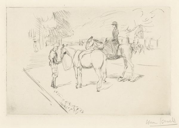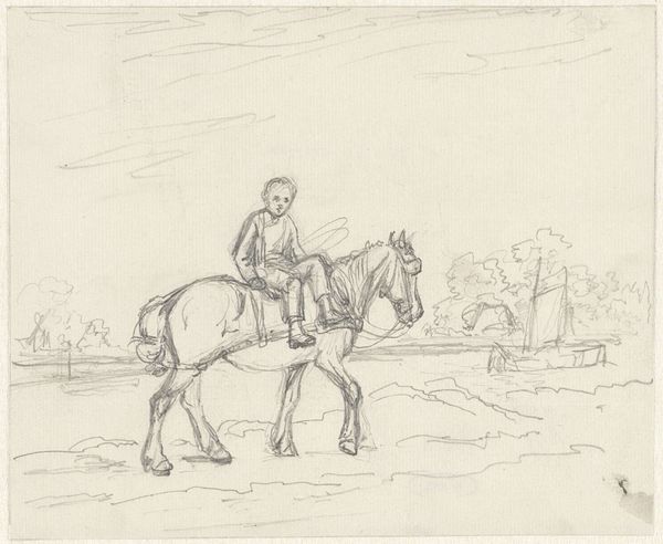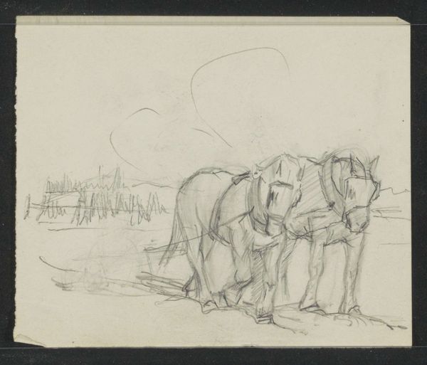 This sketch was created by Jozef Israëls, though the exact date is unknown, and it belongs to the collection of the Rijksmuseum. It's rendered in pencil, a humble material, yet capable of great expression. The marks on the page are economical, and reflect the artist's keen observation of the scene: a farmer loading hay onto a cart, drawn by a horse. The way the pencil lines vary in thickness and direction, creates a sense of volume and texture, describing the weight of the hay and the solidity of the horse. The subject itself speaks to labor, and the relationship between humans, animals, and the land. Israëls, known for his social realism, often depicted the lives of working-class people, elevating their everyday existence through his art. The sketch's quick, decisive lines suggest the urgency and rhythm of the farmer's work, and evoke the broader social context of rural life. By focusing on these subjects, Israëls blurred the lines between fine art and the realities of daily toil.