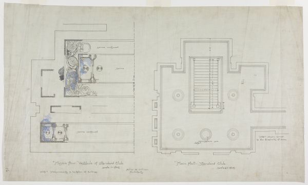 Curator: Looking at "Design for Top Portion of a Gate, Full-Size," a mixed-media piece incorporating drawing, watercolor, and print, crafted by Richardson Ellson & Co. between 1875 and 1885, and currently residing at The Met, I’m struck by its delicate balance of function and aesthetics. The work exemplifies the ideals of the Arts and Crafts movement, showcasing how everyday objects can be elevated through thoughtful design. Editor: Oh, it feels like stumbling upon a secret map! Or maybe a whimsical architectural blueprint from a children's storybook. The pastel washes give it such a light, airy quality, but there’s a strong sense of underlying geometry, a blueprint for a very fancy gate. Curator: Indeed. This design allows us to delve into the socio-political underpinnings of the Arts and Crafts movement. By emphasizing handcraftsmanship and artistic integrity in industrial design, creators were actively responding to what they saw as the dehumanizing effects of industrialization and mass production. The choice of materials and the visible "hand" in the rendering pushes against that alienation, offering a vision of a more humane modernity. Editor: It definitely feels like a rebellion against stark industrial lines. There’s something so playful about the way the colors are applied, almost childlike in their directness. And I adore how you can see the pencil lines underneath, like the artist is inviting you into their process. The notes on the paper, "chocolate" and "gilt," sound delicious rather than strictly descriptive, adding to its light charm! Curator: I agree; these informal notations offer invaluable context, and humanize the process! Moreover, we should not overlook the significance of its domestic setting—gates demarcate property, establish divisions. In an era of rapid urbanization, the craftsmanship on display presents a symbolic desire for the kind of ordered yet artistic refuge, reflecting the anxieties of industrial transformation. Editor: Seeing it that way, it transforms this little drawing. It’s not just a gate anymore. It becomes a quiet act of defiance, a tiny fortress of beauty in the face of a changing world. Thanks, as always, for showing us that even the most unassuming images can hold deep reflections and implications. Curator: It's an ongoing conversation and exploration—glad to share the journey!