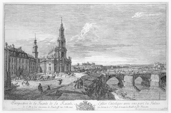 Editor: So, this is "Piazza With Carriages and Pedestrians, Bounded by a Walled Garden and Churches" by Melchior Küsel. It's an etching, and I find the scene quite serene, almost like a stage set. What’s your take? Curator: You know, it does feel like a stage! The way Küsel uses line, it's almost like he's conducting the viewer's eye through the piazza. I wonder what stories those tiny figures could tell? Do you feel drawn into their world, or kept at a distance by the architecture? Editor: I think the architecture keeps me at a distance, although I'd love to be in one of those carriages! I never thought of the tiny figures, but they could probably say a lot! Thanks for your insights.