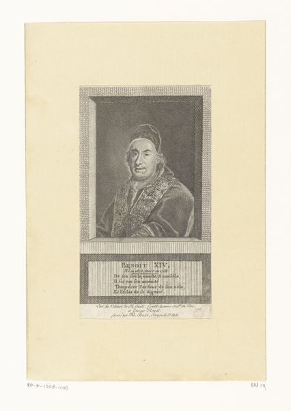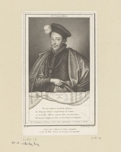 Editor: So, here we have an engraving from 1767 by Antoine de Marcenay de Ghuy. It's a portrait of Charles V, King of France. I'm immediately struck by its formality; the details are so precise, almost stiff. What jumps out at you? Curator: It’s like stepping back in time, isn’t it? Beyond the king’s serious gaze, notice the fleur-de-lis scattered on his robe. These weren't mere decorations; they were bold statements of royal authority, deeply interwoven with French identity. It's not just a likeness, but a constructed image meant to project power and legitimacy. Doesn't that level of carefully crafted symbolism speak volumes? Editor: Absolutely! The fleurs-de-lis really pop. Do you think the artist included them for that reason, as pure symbolism, or to document the style of the era accurately? Curator: Probably both! This engraver was working within the Neoclassical movement, known for its interest in historical accuracy and moral virtue, yet still in service of representing power. Think of it like a stage play: every costume piece, every gesture, is meticulously planned to convey a specific meaning to the audience. Editor: That makes total sense. So, the engraving is trying to tell us a story as much as show us the king? Curator: Exactly! It wants us to think about leadership, legacy, and the enduring strength of the French monarchy. Editor: That’s given me a completely new way of seeing it. It’s much more layered than I first realized. Curator: It always is. Looking closely always reveals stories we never expected.