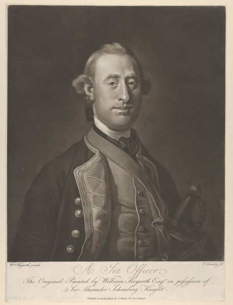 Curator: This is a print depicting Captain Henry Wilson, made sometime between 1784 and 1790. It's currently part of the Rijksmuseum collection. Editor: There’s a somber mood. He’s framed within an oval that almost feels like a locket. The tonal range of the engraving seems quite limited. I'm interested in what the process may have been to create such a detailed portrait. Curator: The artist, Franciscus Sansom, created this print using engraving, a medium perfectly suited to the Neoclassical style it embodies. This particular style often invoked classical history. In that respect, portraiture was not only representational but imbued its subject with an air of gravitas, placing the sitter within a historical lineage of heroism. Editor: Precisely! And speaking of the engraving, observe the minute details rendered: each line meticulously etched to delineate form and texture. Can you imagine the time and labour involved? From a material perspective, we should think about the copperplate itself, the tools used, and the distribution of such a print—it would serve various functions, from commemorating an individual to spreading specific ideologies, or solidifying social structures of power. Curator: Yes, a print like this, reproduced in multiples, served as a powerful means of disseminating an image of authority. Even elements in the background such as the depiction of sailing ships further build upon this. The ship becomes symbolic not only of his profession but a visual marker of global power. It suggests courage, and, of course, Britain’s complex relationship with maritime authority in this period. Editor: What fascinates me is how easily these images, even in their smaller, mass-produced form, contributed to constructing this image of British Naval power. How something, on a simple sheet of paper, participates in these complex, shifting networks of colonial influence. It makes you think about how power gets materialized and distributed, even through these ephemeral items. Curator: I think it brings another dimension to seeing portraits such as this. Editor: Indeed. A powerful memento to a time when the printed image helped cement social hierarchies.