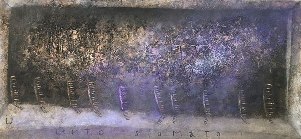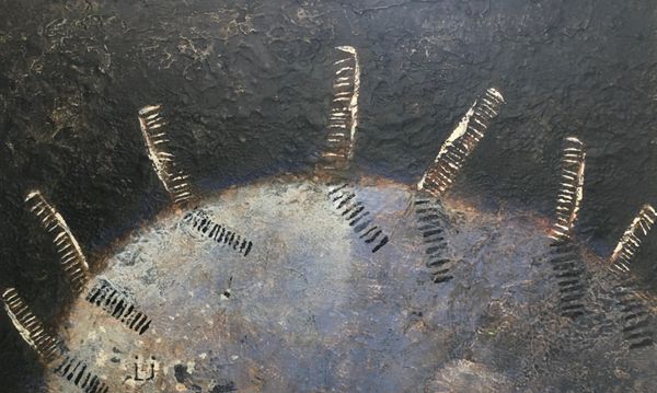 Curator: Lech Jankowski created this artwork, titled 'Wahadło,' in 2020. It is crafted as a matter-painting, primarily using oil paints, fitting within the broader context of abstract expressionism. Editor: Immediately, I notice this profound sense of texture and a kind of gravitational pull toward the lower center. It’s quite heavy, both in tone and apparently in material. Curator: It’s fascinating to consider the political undercurrents within abstraction, especially in contemporary Polish art. Post-communism, artists often navigated a space between state control and complete freedom of expression. An abstract piece like this provides a form of resistance, or at least ambiguity, during politically turbulent times. Editor: Right, but consider the labor involved. This isn't just slinging paint. You can almost feel the artist physically wrestling with the material. The heavy impasto, the scraping, it speaks to a direct, physical engagement – the making itself becomes part of the content. It’s also referencing Arte Povera tendencies to show the ‘poor’ and often rejected material within fine art making. Curator: I wonder how the artist situates themselves relative to established norms and institutional validation, for instance is he positioning his work within or against existing collections and the existing market for abstract art. Editor: Well, that circle and suspended bead almost evoke a pendulum; ‘Wahadło’ means pendulum. Think about that relentless back and forth. And is that balance that the piece achieves or rejects through its form? How do the properties of the material make us conscious of temporality in making and of social dynamics within consumption of painting. Curator: These points enrich my perspective and compel a closer look at the title and composition; that tension is critical, indeed. Editor: Absolutely, engaging with its physical construction and history illuminates its conceptual layers. It forces one to understand its contemporary function but only if considered within a larger historical context and market structure.