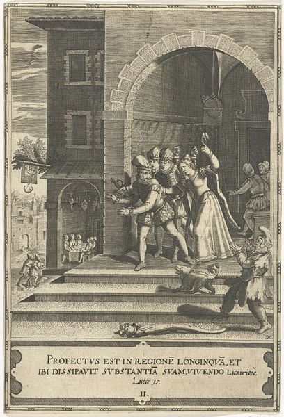 This etching, titled "The Prodigal Son Feasting with Harlots," by an anonymous artist, offers a glimpse into social and moral themes of its time. The image portrays a scene of revelry, a cautionary narrative about moral decay and the dangers of excess. The "prodigal son," a figure from biblical parables, is shown squandering his inheritance amidst the company of women, drinkers, and gamblers. The setting, likely intended to depict opulence, becomes a stage for questionable behavior and a departure from traditional values. The artist captures the emotional undercurrent of the story—the allure of immediate pleasure juxtaposed with the looming consequences of reckless choices. The presence of the dog, a symbol of loyalty, adds a layer of irony to the scene, highlighting the son's abandonment of familial duty. The Dutch text beneath the image translates to an invitation to drink freely and indulge, reflecting the complex cultural attitudes towards pleasure and morality.