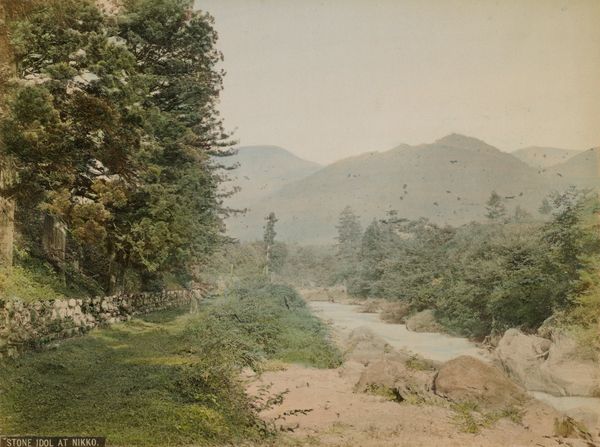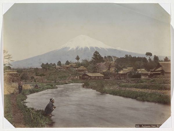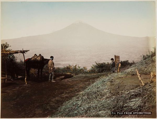 Curator: This photography album at the Minneapolis Institute of Art gives us glimpses into life in Japan between the 19th and 20th centuries. The gelatin silver prints show diverse subjects including excavation and survey scenes. Editor: What strikes me immediately is how the massive scale of Mount Fuji looming in the background is balanced by the repetitive lines the fieldworkers are creating in the earth below. Curator: Indeed, Mount Fuji had a massive cultural significance in Japan, often serving as a symbol of national identity. To see it here behind fieldworkers reminds us about the social history. Editor: Absolutely. And consider how the photographer has used aerial perspective; Fuji is pale and almost hazy, but it has a very crisp outline that emphasizes how far away it is. The framing also creates a lovely sense of depth, starting with the immediate foreground all the way back to that distant mountain. Curator: You are right about how the aerial perspective gives off haziness. Also, it could show something about landscape as an ideology during Japan's shift from feudalism to modernity. This also makes me think about its impact on shaping narratives around Japan in travel, art and culture at this moment. Editor: It's also intriguing how they managed color, possibly through hand-tinting, on these gelatin silver prints. The earth tones give such a tangible, grounded presence while the people show a gentle contrast, yet still blend so they have a cohesiveness. The slight palette has visual tension. Curator: Good point, color definitely adds another layer! It reveals a romantic, idealized picture, and how such visual imagery was consumed among certain populations in the West and beyond. And what role did they play? That would be another good discussion point. Editor: Agreed. Considering all the points we have looked at so far, I’m now understanding new ideas of its formal organization while I listen to the story behind its history. Curator: Yes, and with a focus on cultural implications, we understand why this image made its appearance and can discuss and dissect it for more layers of understanding!
