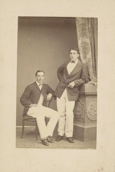 Editor: So, this gelatin silver print by Hill and Adamson, called '[Two Unidentified Men],' made sometime between 1843 and 1847... it feels so austere. The tonal range is quite limited and gives a somewhat melancholic atmosphere. What do you see in this piece? Curator: I see more than just a melancholic portrait; I see a document steeped in the complexities of early photographic representation and its impact on social hierarchies. How do these men position themselves within a rapidly changing world, facing evolving social norms and power dynamics reflected by their conscious decision to be photographed? Editor: Conscious decision? In what way? Curator: Consider the act of commissioning a photograph in the 1840s. It wasn't like snapping a quick selfie. It involved expense, time, and a deliberate engagement with the process. Their choice of clothing, posture, even the fact that they are together—all these elements tell a story. It makes you wonder what the societal pressures were like for portraiture at the time, and how their identities were negotiated in relation to gender, class, and community standards. Who had the agency to have portraits commissioned? Who didn't, and why? Editor: So you’re saying their decision to be photographed wasn’t merely about documentation, but a negotiation of identity within a social structure. Curator: Exactly. Early photography democratized image production to some degree, while also replicating existing inequalities. Hill and Adamson's work exists at this fascinating intersection, highlighting who was given visibility, and what statements these carefully constructed images were meant to convey to the audiences of the time. Editor: I’m not sure I would have thought about that… that their portrait itself might be a statement, reflecting an exercise of agency. Curator: It's easy to forget the political dimensions inherent in any visual representation, particularly in its nascent stages. We need to examine photography through a critical lens, analyzing power, privilege, and the act of representation itself. Editor: Thanks; I see this photo so differently now!