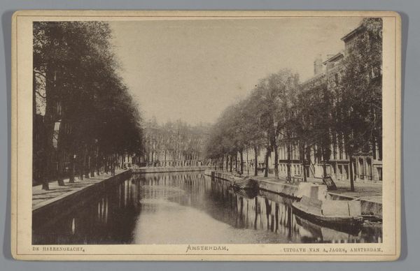 Curator: This gelatin-silver print, titled "Gezicht op de Herengracht te Amsterdam," or "View of the Herengracht in Amsterdam" in English, was taken by Andries Jager some time before 1907. The Herengracht, as you can see, is beautifully captured, with a serene canal lined by trees and elegant houses. It's currently housed in the Rijksmuseum. Editor: My initial reaction is one of profound stillness. It feels almost ghostly. There's this incredible, soft light blanketing everything. The boat in the foreground seems frozen in time. Curator: The stillness you mention resonates with the subject matter. Amsterdam’s canals, especially the Herengracht, were symbols of prosperity and order. They reflected not just the city’s wealth, but also its civic pride and meticulously planned urban design. The gentle curves of the canal invite the gaze deeper into the composition, almost beckoning toward unseen narratives, shrouded in the atmosphere of that golden light. Editor: I’m so drawn to the way the artist uses light here. It diffuses, almost blurs the architecture, rendering these solid buildings into something ethereal. It also makes me think about water itself as a symbol of fluidity, transition, and, of course, reflection. This photo offers not just an image of Amsterdam, but a mirror to contemplate change. The mist hanging over the water acts almost like an ink blot test – maybe there's melancholia at play too? Curator: I think your observations strike a particularly apt chord. Gelatin-silver prints, especially from this period, carry inherent symbolic weight, preserving the past in monochrome. Amsterdam, as a city, embodies maritime power, its global trading legacy intertwined with its waterways. Canals are potent symbols; pathways that bridge the city, connecting cultures. Editor: I wonder what stories those buildings could tell, hidden behind that misty facade. This photograph almost romanticizes a place but in a strangely muted way, I like that it makes you linger. Curator: Precisely. The artist leaves enough space for us to add our personal interpretations, letting history intermingle with the now. A dialogue with time itself. Editor: That's how all art should be, really—an ongoing conversation. Curator: A resonant point, one that finds voice in art. Editor: Hear, hear to that.