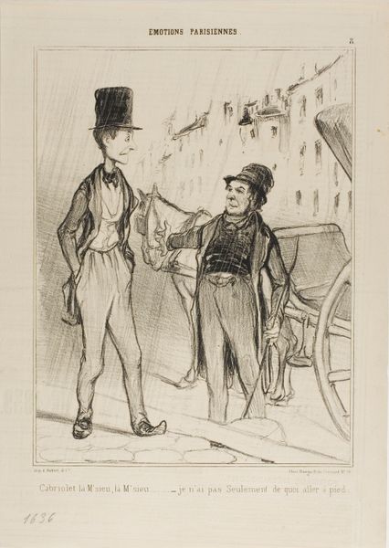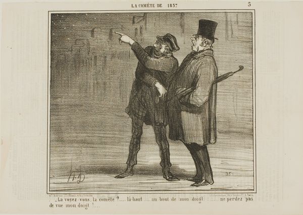 Editor: We’re looking at Honoré Daumier's lithograph from the 19th century, entitled “Vous verrez…rien n'échappera a la baisse…”, which translates to “You will see…nothing will escape the decline.” I'm struck by how effectively Daumier captures a mood of anxious secrecy with just a few lines. What story do you think Daumier is telling here? Curator: Daumier’s lithographs are potent commentaries on Parisian society, particularly during the July Monarchy and the rise of finance. Here, the image critiques speculative economics, as evident in the title itself. These aren't just characters; they're representative of a society consumed by financial anxieties, highlighting the public role of art as social critique. Editor: So it's not just a drawing of two guys chatting. The context of the time matters. How did the public perceive his caricatures? Curator: Exactly. His works were widely disseminated through newspapers like "Le Charivari," shaping public opinion on political figures and social trends. Daumier's sharp wit often landed him in trouble with the authorities, who were not always amused by his satirical take on their governance and the bourgeoisie’s greed. Do you notice how he uses light and shadow to create a sense of unease? Editor: Yes, especially around their faces, giving them almost grotesque expressions. Was Daumier part of a particular artistic movement? Curator: While displaying elements of Romanticism in his emotional intensity, Daumier’s commitment to portraying everyday life aligns him with the Realist movement. He used realism not as mere imitation, but as a tool to expose social and political realities. He politicized the print. Editor: That’s fascinating. I hadn’t considered the print medium as such a powerful tool for social commentary at that time. Curator: Daumier proves that art is inherently linked to its socio-political environment. Editor: I see now how important understanding historical context is to appreciate Daumier’s work. Thanks for opening my eyes.