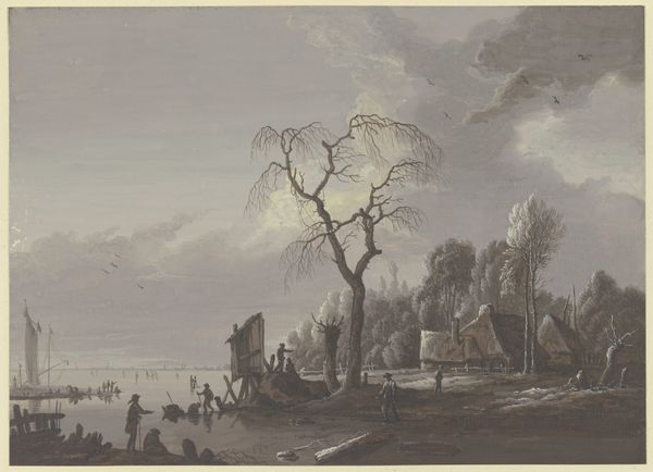 Josephus Augustus Knip created this watercolor landscape, "Gezicht met een dorpskerk en 's-Hertogenbosch in het verschiet," offering a glimpse into the Dutch countryside and life in the early 19th century. The painting presents a serene, idealized view of rural life, but it also subtly speaks to the social dynamics of the time. The figures are arranged in a way that hints at class distinctions: on one side, a hunter, perhaps a leisure activity for the upper class, and on the other, a family gathered by a modest dwelling. Knip gives us a quiet, observant perspective on the Netherlands as it navigated changes in its social and political landscape. The artwork invites us to reflect on the emotional resonance of place and belonging. What does it mean to call a place home, and how does the land shape the stories we tell about ourselves?