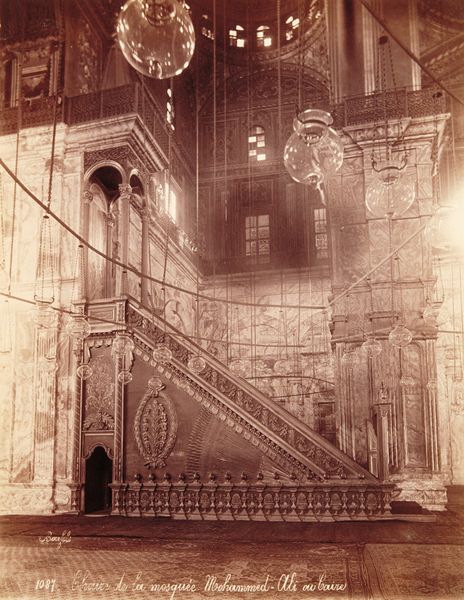 Editor: This striking vintage albumen print, "Interieur de l'Eglise de la Nativit\u00e9" taken in the 1870s by F\u00e9lix Bonfils, captures an interior view of the Church of the Nativity. The sepia tones lend it an air of timelessness, and almost create a blurring effect, making the space seem to ripple with secrets and echoes. What do you make of it? Curator: For me, it’s a bit like stepping back into time. I love that albumen prints are like these ghostly, beautiful time capsules. You know, the Church of the Nativity itself is one of the oldest standing churches in the world, built atop the site believed to be Jesus' birthplace. So Bonfils wasn’t just capturing architecture; he was capturing centuries of devotion, literally layering history. Does that sense of the sacred space come across to you as well? Editor: Absolutely, the ornamentation speaks to this, especially the dangling lamps. Were they really hanging there in Bonfils' time, or were such elements added later on? Curator: Those lamps almost certainly would have been present. It’s a characteristic of many Eastern Christian churches. The light, often oil lamps, are a symbol of Christ. Can you see, too, how the photographer staged this to emphasize depth? Look at the deliberate use of light and shadow to create a focal point, directing our eyes towards the heart of the sanctuary. Editor: It's a really interesting staging of the space. It definitely draws your eye to different levels of ornamentation. I noticed, the absence of people makes the building feel eternal, but it might also reflect the political and religious climate of that era. Curator: A powerful insight. By omitting the figures, the space becomes, paradoxically, a stage for the imagination. But the fact that the photographer captured this sacred interior offers a look at history. Editor: Well, it makes me appreciate both Bonfils' work, and the historical significance of the space he captured. Thank you. Curator: My pleasure! I learned as well, a new perspective makes every photograph just a bit richer.