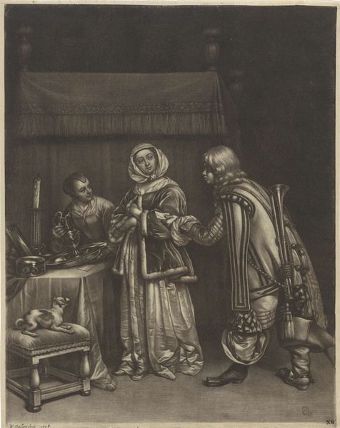 Jan van Somer created this print, titled "Geweigerde brief," or "Refused Letter," in 1676. It depicts a woman in a domestic setting, refusing a letter from a messenger. Prints like this one, made in the Netherlands, served an important function in disseminating images and ideas during the Dutch Golden Age. This work reflects the social norms and values of the time, particularly concerning gender roles and courtship rituals. The woman's refusal could be interpreted as an assertion of her independence, or an adherence to strict social expectations around courtship. By studying prints like this alongside other historical documents like conduct manuals, diaries, and literature, we can gain a deeper understanding of the complex social dynamics of the 17th century Netherlands. Art, in this sense, is a window into the past, reflecting the ever-changing values and power structures of society.