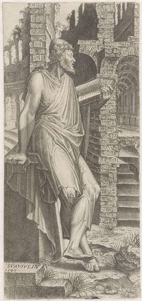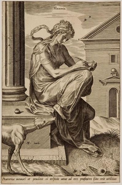Curator: Cornelis Cort's engraving, "The Virtues: Sobrietas," dating back to the 16th century, presents a compelling figure. Editor: My eye is immediately drawn to the textures Cort achieves through the intricate linework—the flowing drapery against the smooth skin, creating a sense of depth and movement. Curator: Yes, and consider the symbolic language: Sobrietas, or Sobriety, is depicted with a key—a symbol of restraint, unlocking wisdom and good counsel. She subdues a sea monster, embodying control over base desires. Editor: The composition is equally striking. She sits confidently, almost enthroned atop this subdued beast, set against the stark architectural backdrop which emphasizes her dominance over nature. Curator: Indeed, the imagery of the birds overhead suggests a transcendence, an aspiration toward higher ideals fostered by temperance. It reflects the period's investment in classical virtue. Editor: It's fascinating how Cort uses stark contrasts in the engraving to communicate these complex moral concepts, rendering abstract virtues in palpable form. It provides a lens into the past. Curator: It certainly enriches our understanding of how virtues were visualized and embodied in early modern Europe.
