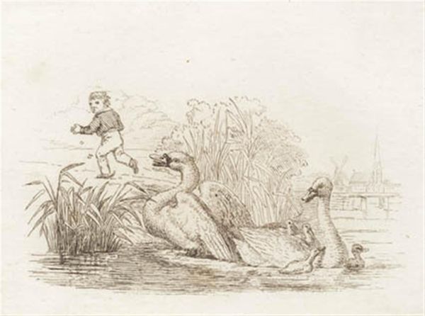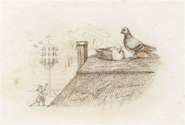 Martinus Rørbye made this pen and ink drawing, "Illustration til 'Halvhundrede Fabler for Børn' af Hey," to accompany a book of children's fables. Rørbye, a Danish Golden Age artist, produced this illustration around the 1840s, a time when national identity and cultural values were being shaped through literature and art. The image presents a bucolic scene with storks nesting atop a thatched roof, set against a backdrop of rural life. In Danish folklore, storks are symbols of good fortune and fidelity, often associated with bringing babies to families. Their prominent placement in this illustration underscores the cultural significance of family and nature in 19th-century Denmark. Rørbye's illustration is not just a charming depiction of nature, it reflects the values and aspirations of Danish society at the time. To better understand this, you might look at collections of Danish folklore, illustrated books, or even publications from the Royal Danish Academy of Fine Arts, where Rørbye studied.