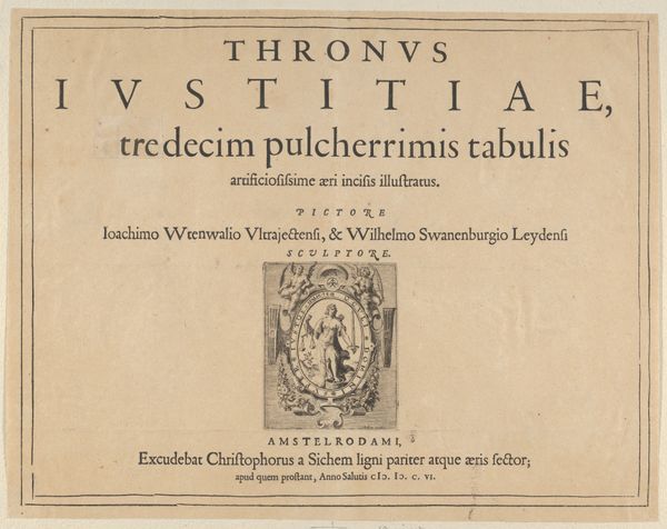 Editor: We're looking at the title page for "Thronus Justitiae" from 1606, created by Zacharias Dolendo. It's an etching, a print on aged paper. I'm immediately struck by the intricate typography and the old engraving style – it has a really archaic feel. What do you see in this piece? Curator: Oh, archaic is a perfect word! For me, these title pages are portals. Imagine standing in a 17th-century bookstore, your fingers tracing those very letters. This isn’t just decoration; it’s a promise. It's selling you twelve exceptionally beautiful plates on Justice, all cunningly etched. "Cunningly," I like that word here; it implies artfulness, a little wink to the reader. Look at that small illustrative vignette; it acts as a sort of emblem of what is inside the book! What is it saying? It gives a clue, no? It may reflect larger societal interests in law, virtue, governance at this specific moment. Editor: Definitely a clue. I'm guessing it represents Lady Justice? And I love that idea of a portal...so it's a bit like a film poster today, promising something within? Curator: Precisely! Consider the context: the printing press democratized knowledge, but it also had to *sell* knowledge. Dolendo is selling the very *idea* of Justice – and perhaps a certain view of power that Justice can enable. It is thought-provoking, really. The whole composition really is a statement in and of itself about civic responsibility. Editor: It’s fascinating to think about the book as a commodity and how much is communicated, even on the title page. Thanks; I'm going to look at these differently now. Curator: My pleasure. Me, too! Now I'm going to keep my eyes open for book title pages in other collections. I wonder if the same principles hold?