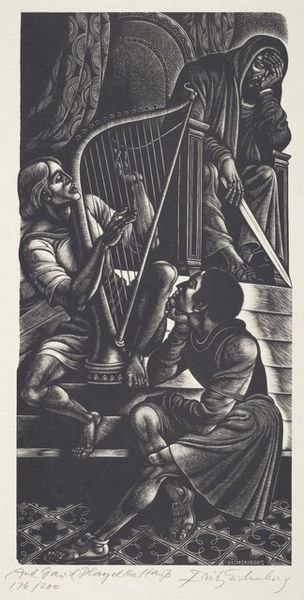 This is Chaim Goldberg’s woodcut, Bassist. The stark black and white immediately grabs you, right? It's not just about what’s depicted but how it’s depicted—the aggressive cuts, the way the white lines are so deliberately carved. Look at the musician’s face. See how Goldberg uses these dense, close lines to create depth and shadow? It’s like he’s chiseling away at the darkness to reveal the form, a testament to Goldberg’s background in sculpture. It’s so tactile, you can almost feel the weight of the wood. And the repetitive lines creating the sky reminds me of Van Gogh, that feeling of motion and emotion! What I love about prints like this is how they transform a scene into something raw and immediate. This piece feels like a conversation across time, a dialogue with expressionist roots. It's a powerful reminder that art is never finished, only abandoned.